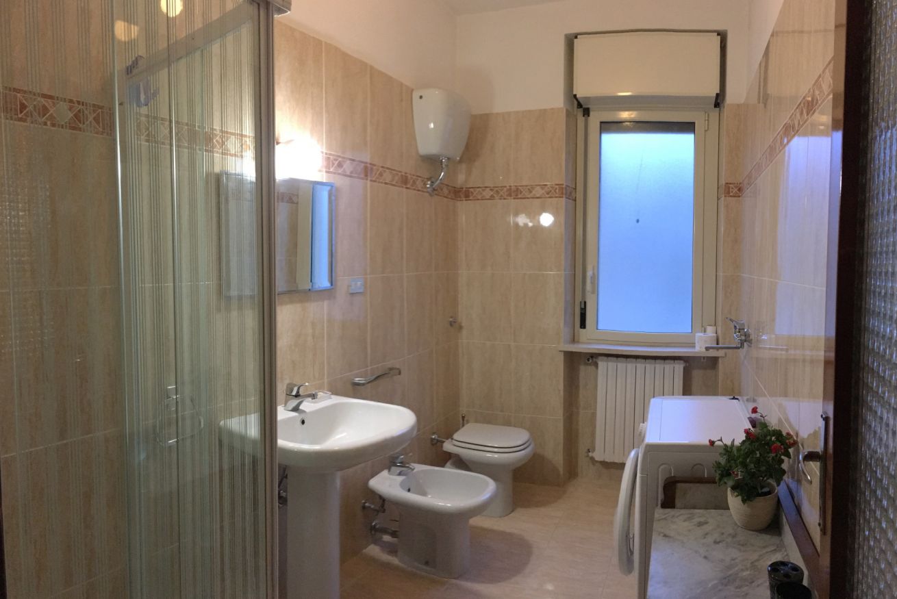 Il bagno è fornito di una cabina doccia e della lavatrice.